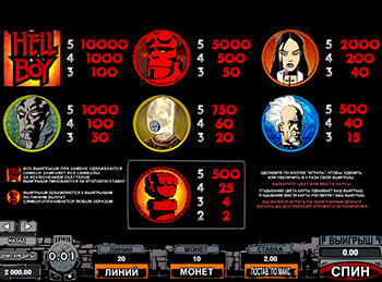 На барабанах видеослота Вы увидите героев истории: самого Хеллбоя, Лиз, Эйба, профессора и т.д. Символ разброса в автомате Hellboy имеет картинку кулака главного персонажа. Собрав комбинацию из трех, четырех или пяти подобных иконок, вы перейдете к бонусному режиму. Подземный призовой бонус подарит много ощутимых выигрышей. Изображение Хеллбоя – это Wild символ. Он является альтернативой для остальных иконок за исключением Scatter и может создавать выигрышные комбинации. В игровом слоте выставляется от 1 до 20 линий. Такое решение считается успешным внедрением разработчиков. С двадцатью активными полосами затраты на ставку будут небольшими, а шансы на получение призов достаточно велики. Главный джекпот автомата Hellboy – 10000 кредитов, поэтому лучше играть с максимальной ставкой.