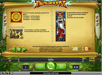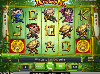 Азартные игры на тему восточных боевых искусств практически всегда вызывают интерес у геймеров. А если это еще и видеослот от такой известной компании, как Netent, в арсенале которой уже есть несколько десятков отменных моделей, то популярность ему гарантирована. Игровой автомат Thunderfist предлагает познать тонкости боевых искусств, которыми владеют самураи и ниндзя. Играйте в онлайн казино Вулкан, чтобы ознакомится с разнообразными функциями симулятора. Мужество и отвага проявляется на геймплее слот-машины, состоящей из пяти стремительных барабанов. Вместо классических линий вы сможете воспользоваться 243-мя способами получения призовых цепочек. Выигрышные комбинации формируются из одинаковых символов (от 3 до 5), расположенных на соседних барабанах, начиная с первого. Визуальное оформление игры выполнено на высоте – катушки, расположенные на фоне леса, овиты мощными ветвями бамбука. На экране представлены номиналы карт от туза до 10 и изображения пяти воинов.